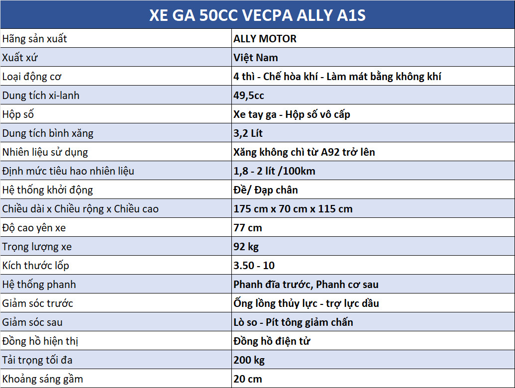 THÔNG SỐ KỸ THUẬT XE GA 50CC ALLY A1S: