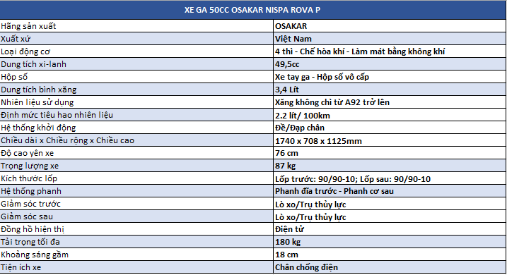 Xe ga 50cc Osakar Rova P là một mẫu xe dành cho các bạn học sinh , không cần bằng lái , vận tốc tối đa dưới 50km/h . Xe có thiết kế nhỏ gọn ,vận hành ổn định và rất ít phát sinh bảo hành và được bảo hành lên tới 3 năm tại Xe Lan Anh