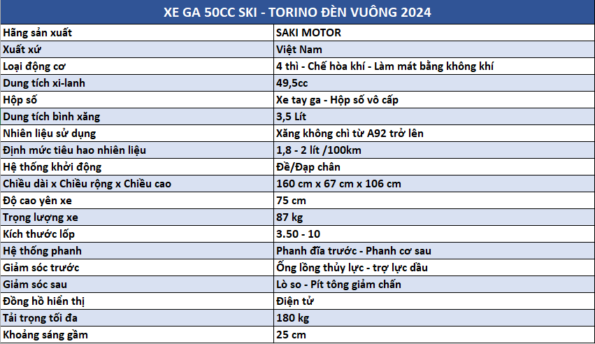 Saki Ski-Torino 50cc là mẫu xe ga 50cc nổi bật với thiết kế đèn vuông đặc trưng, mang đậm phong cách cổ điển kết hợp hiện đại. Đây là lựa chọn hoàn hảo cho những ai đang tìm kiếm một chiếc xe tay ga 50cc không cần bằng lái, vừa đẹp mắt, vừa tiện dụng cho việc di chuyển trong đô thị.