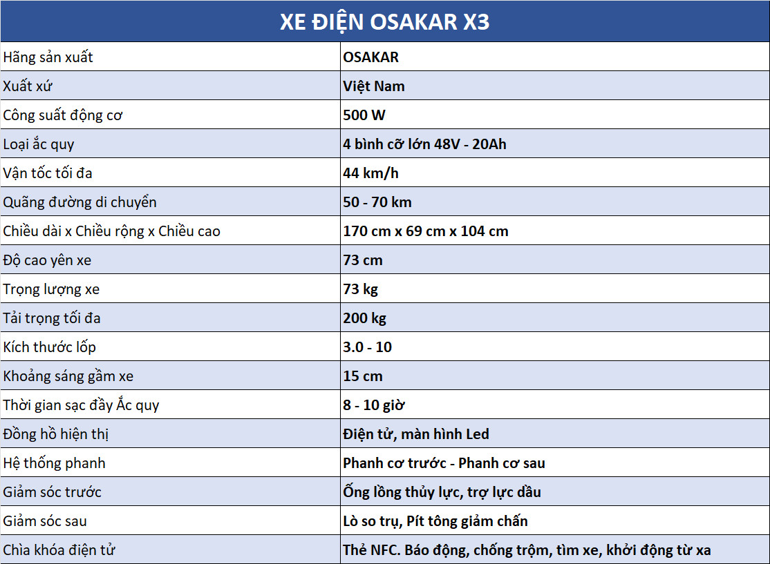 THÔNG SỐ KỸ THUẬT XE ĐIỆN OSAKAR X3: