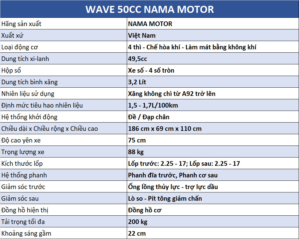 THÔNG SỐ KỸ THUẬT WAVE 50CC NAMA MOTOR: