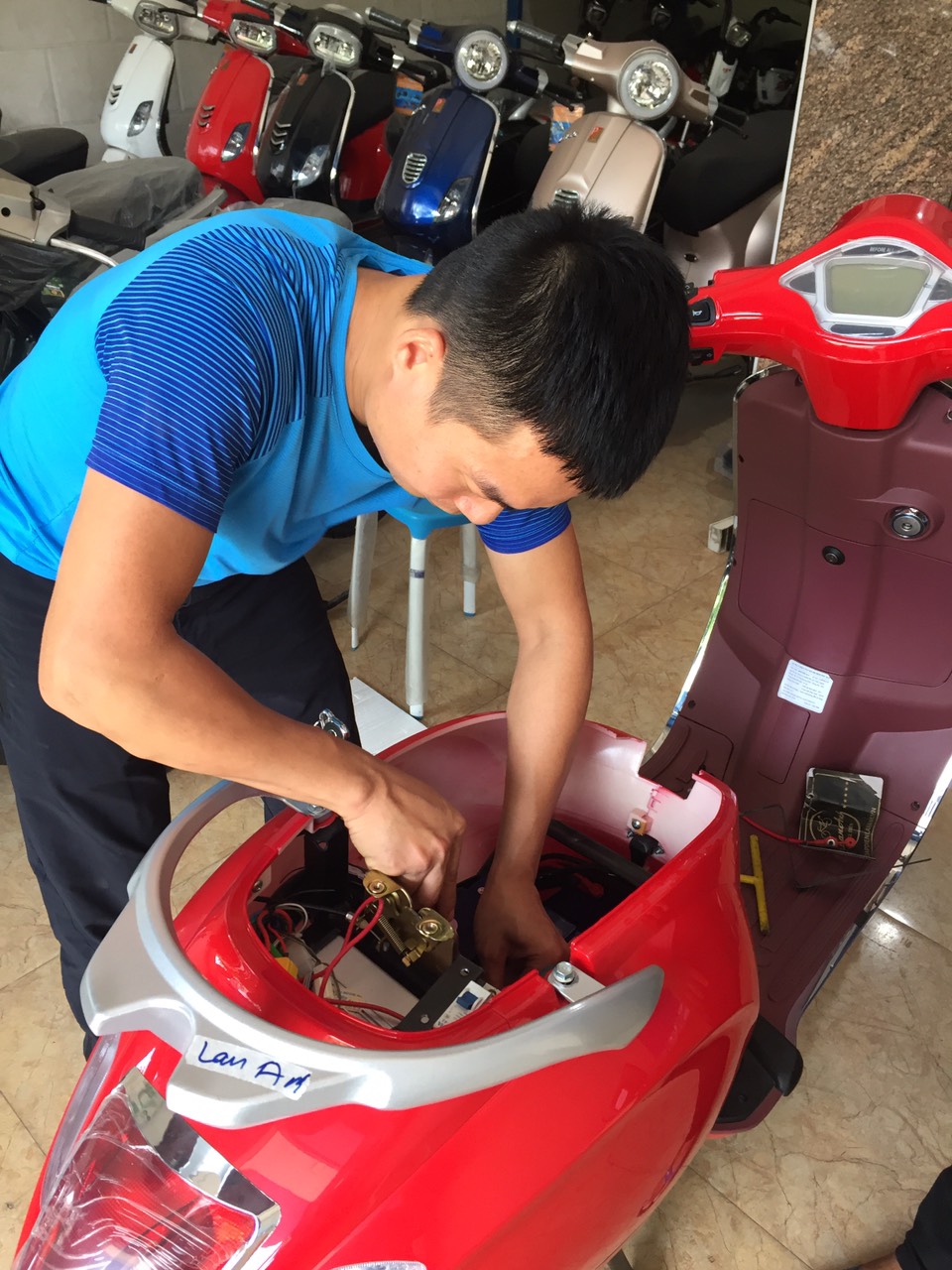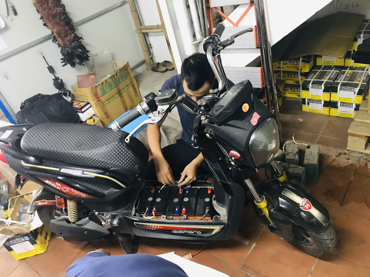 Kỹ thuật đang thay ắc quy xe máy điện Xmen tại Xe điện Lan Anh