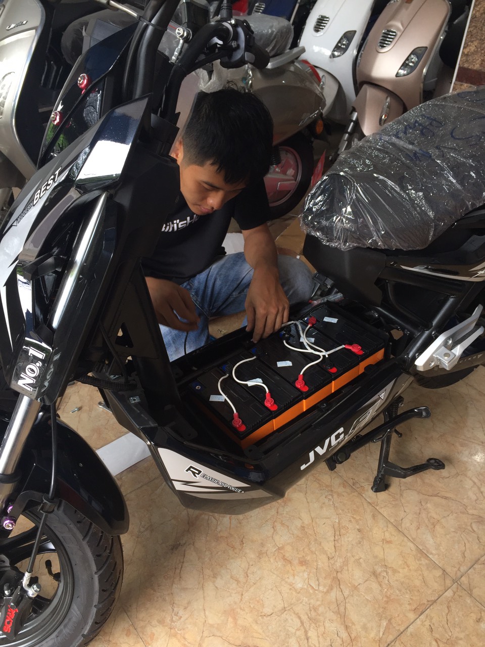 Kỹ thuật đang thay ắc quy Yali Anmshi cho xe đạp điện M133 tại Xe điện Lan Anh