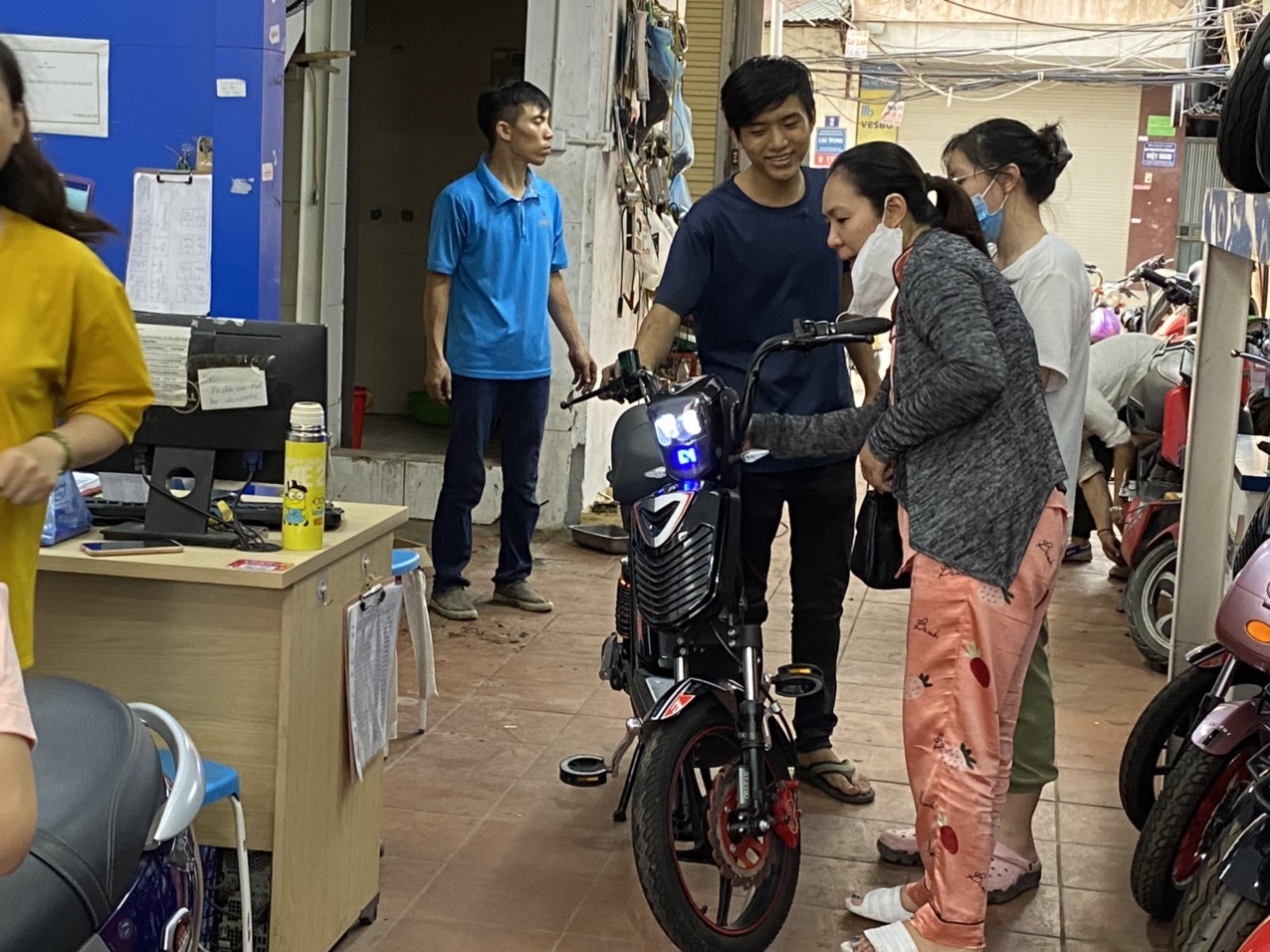 Kỹ thuật đang hướng dẫn khách hàng sử dụng xe đạp điện Nijia tại Xe điện Lan Anh