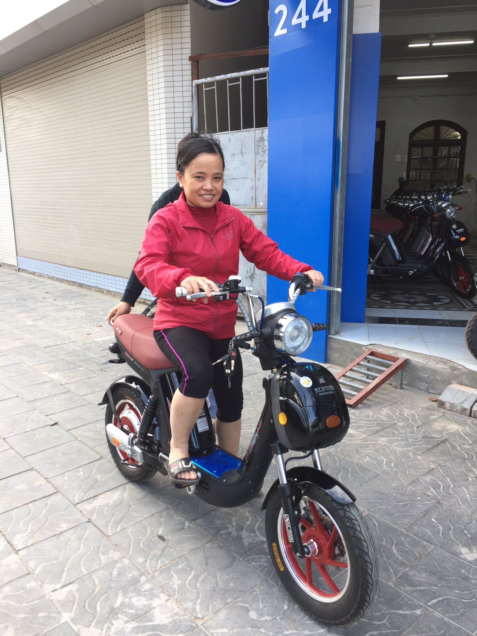 Nay chị có xe mới để đưa đón con đi học rồi, chị vui lắm