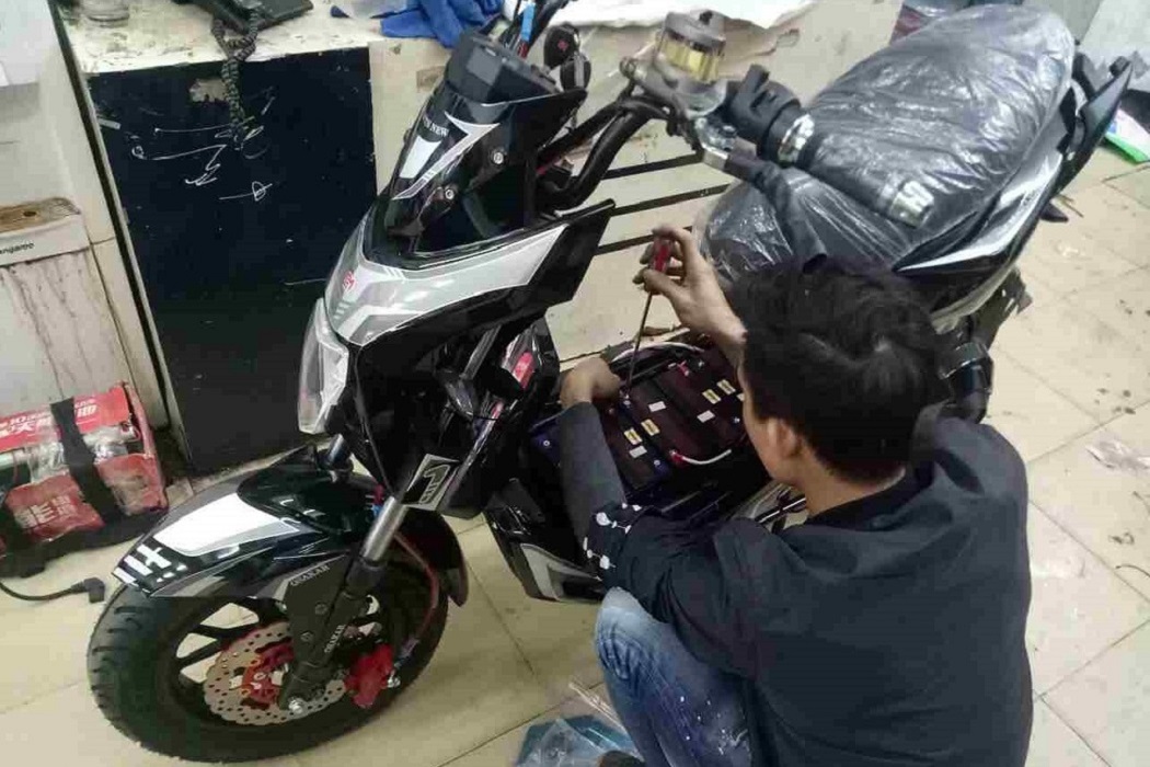 ( Ảnh kỹ thuật bên Lan Anh đang thay ắc quy xe điện )