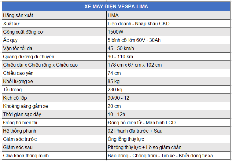 ( Ảnh thông số kỹ thuật xe máy điện Vespa Lima- Xe điện Lan Anh )