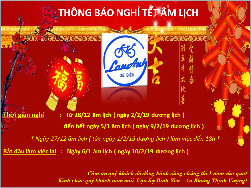 Đồng thời, Xe điện Lan Anh cũng xin thông báo tới quý khách hàng lịch nghỉ Tết và làm việc trong dịp Tết Nguyên Đán Kỷ Hợi 2019 này