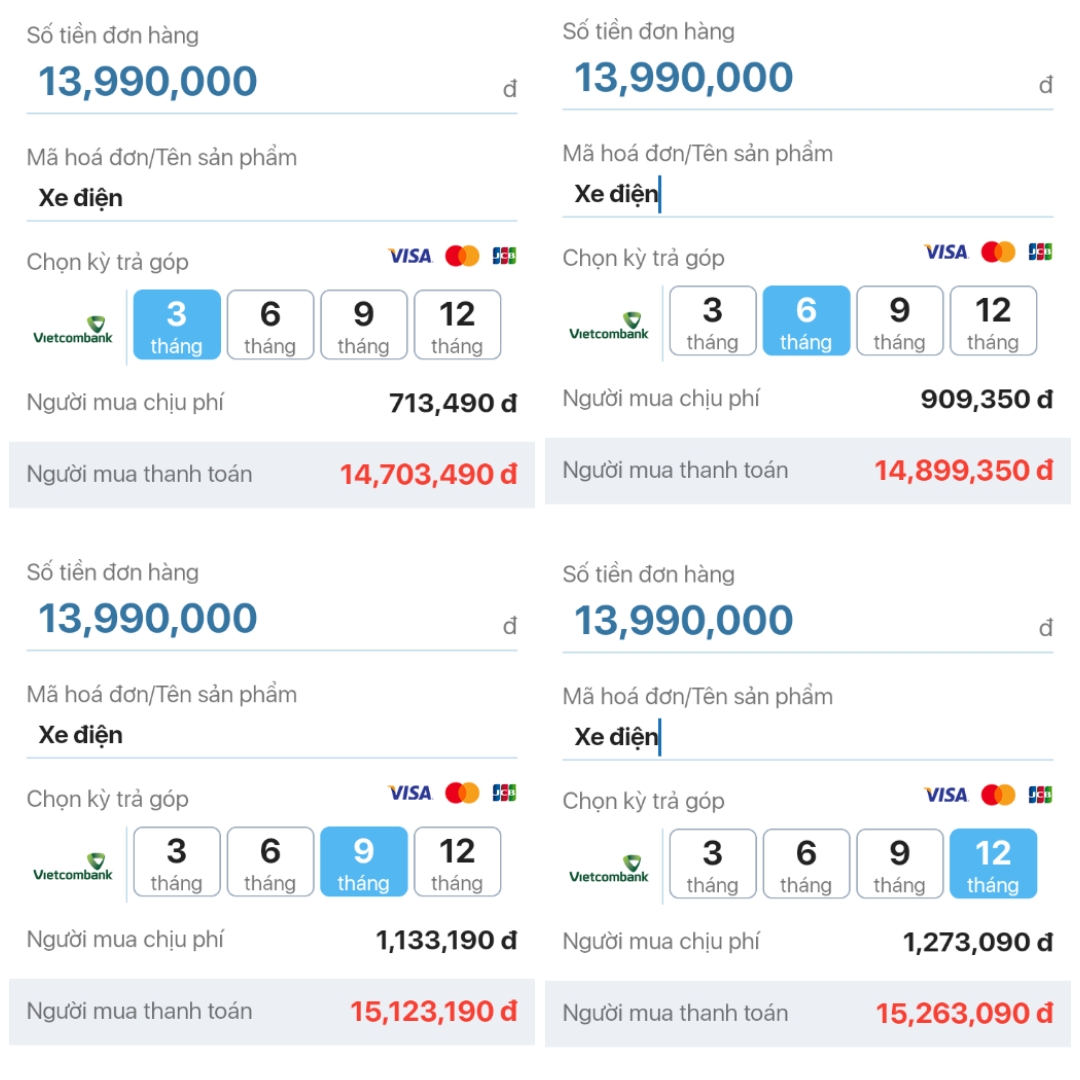 Ví dụ một chiếc xe máy điện Xmen Osakar Pro giá 13.990.000 bạn trả góp bằng thẻ tín dụng của ngân hàng Vietcombank thì mức phí sẽ như hình ảnh sau