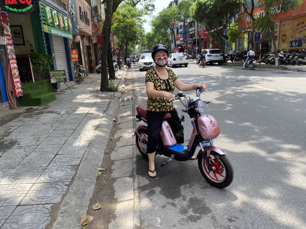 Bác gái trông trẻ ra khi ngồi trên chiếc xe đạp điện Nijia - Xe điện Lan Anh
