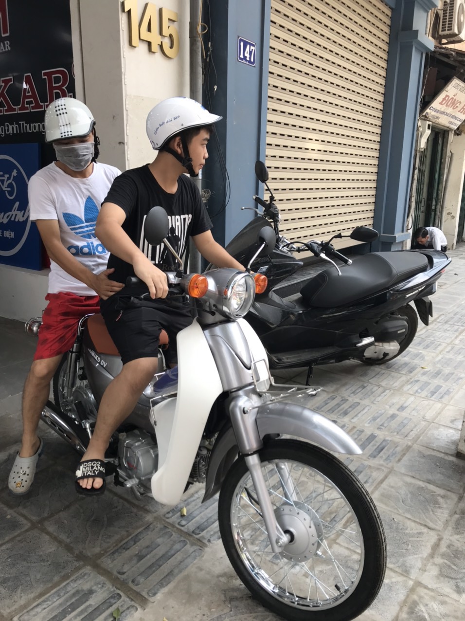 Hai bố con vừa mới tậu em Cub 50cc Daelim IKD nhà Lan Anh ra