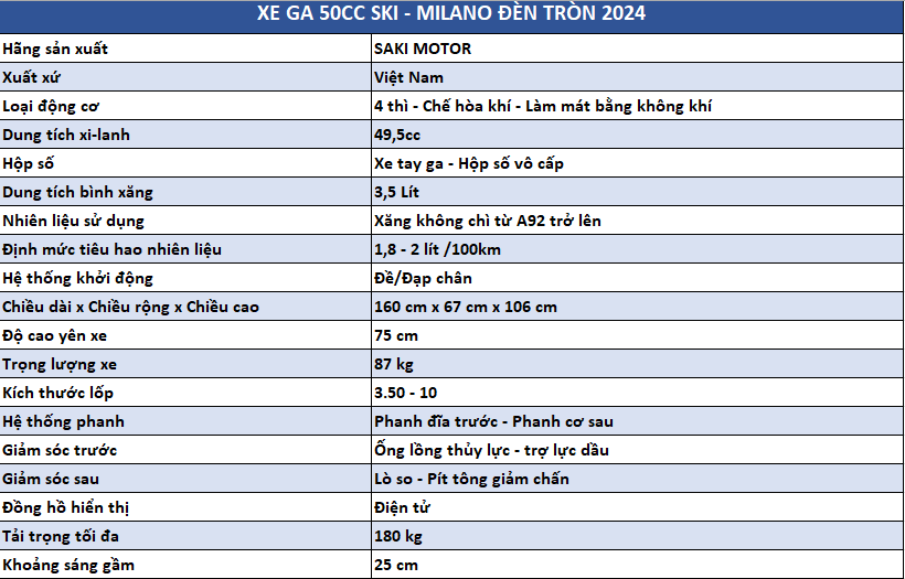 Với những ưu điểm vượt trội về cả thiết kế và hiệu suất,Saki Milano 50cc là lựa chọn hoàn hảo cho những ai muốn sở hữu một chiếc xe ga hiện đại, tiết kiệm nhiên liệu và dễ dàng sử dụng.